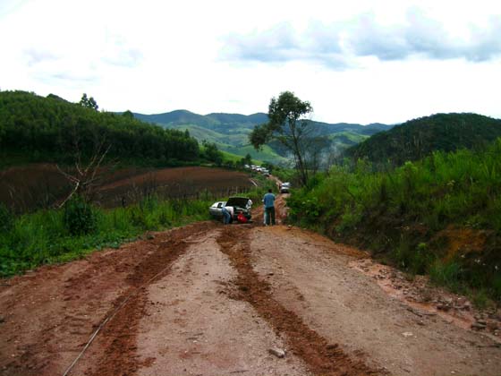 Com o caminho desimpedido, ficamos já "quentes" pra enfrentar as temidas árvores do Jurassic Park, nossa trilha final antes de chegar a Monte Verde... mas no caminho, cruzamos com uma familia de moradores locais em sérias dificuldades... o casal têm um bebê de colo, e o Gol não consegue subir uma pequena ladeira enlameada... hora do resgate !