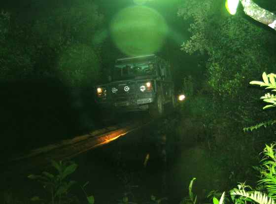 Apenas 3 carros passam a ponte, quando decidimos enviar 2 carros na frente para fazer um reconhecimento do terreno... a Def90 do Biagio e a Lady Disco da Erô recebem esta "dificil" missão e todos ficam monitorando no rádio os acontecimentos.... o breu da noite é total, e não dá pra enxergar nem onde se pisa...