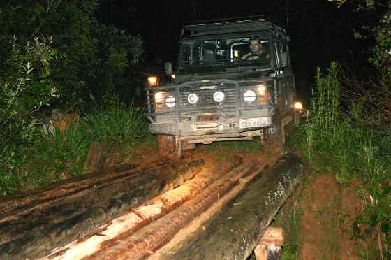 Já são 8 horas da noite quando passamos a ponte de acesso ao Jurassic Park, uma área de reflorestamento bem proxima a Monte Verde... a ponte foi reformada, e a passagem é feita com tranquilidade, mas é impossivel relaxar com o jipe a 3 metros de altura apoiado apenas em troncos, estilo pontes do Camel Trophy...