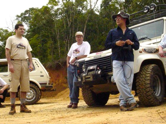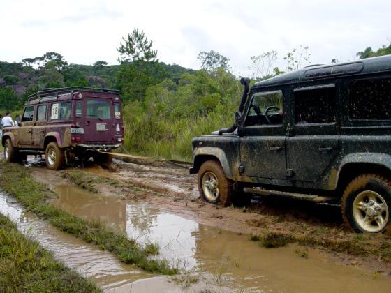 Nada como obter conselhos ao pé do ouvido he he... "Mestre" João Roberto nos dá as dicas para o obstáculo a seguir, um atoleiro mais profundo onde o carro normalmente perde tração ao tocar o diferencial no facão que a lama esconde. O "Marechal" como é chamdo o Defender do João é posicionado estratégicamente para retirar os atolados...