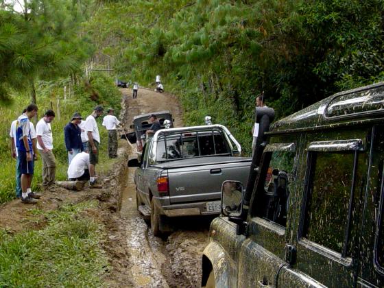 A parte prática do curso começa com uma subida em erosão, onde a escolha do caminho é determinante. Estamos no meio do grupo, e vários carros vão subindo na nossa frente, sendo que alguns enroscam no meio e têm que manobrar para poder sair do enrosco. O divertido é que não é preciso guincho, apenas uma boa técnica na direção e obviamente um pouco de sorte he he...