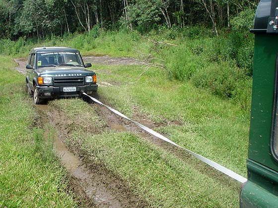 Agora somos dois pontos verdinhos no meio da floresta da Bocaina... e agora, como vamos fazer ? O jeito é apelar para a ancora de solo da Ensimec, uma vez que não há pontos de ancoragem nas proximidades... primeiro tiramos a 90tinha, e depois fazemos uma operação mais complicada para tirar o Komodo, pois os eixos já estão bem fundos na lama... o Becker dá uma puxada no guincho pra trás, e então conseguimos colocar a ancora em solo firme para seguir adiante...