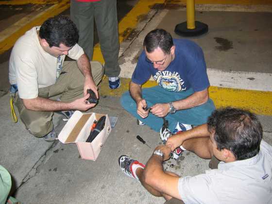 No ponto de encontro na saida de Sampa, ficamos sabendo que o White Elephant do nosso amigo Borja está meio esquentado... ele consegue chegar ao posto, onde tentamos então efetuar o reparo em um vazando de água... o jeito é apelar para minha maleta do McGuiver he he...